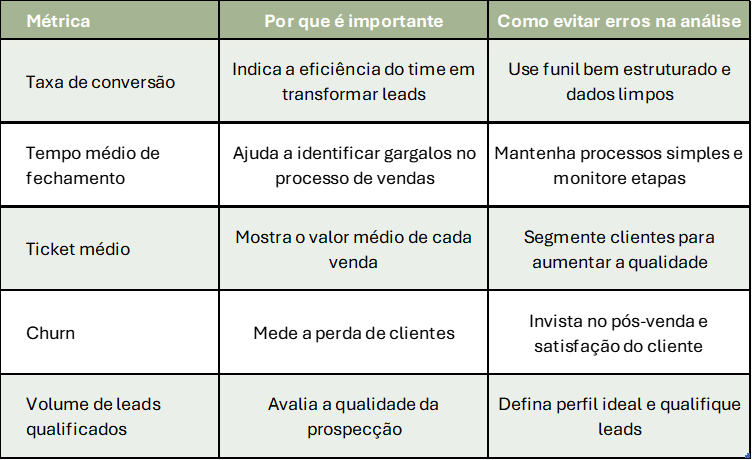 - Priorize até 10 métricas que estejam alinhadas com os objetivos estratégicos do seu time, como taxa de conversão, ticket médio, tempo médio de fechamento e churn.